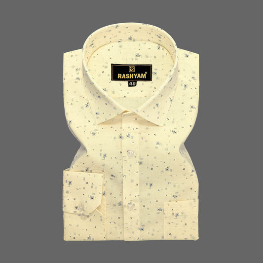 Luxurious Italian Linen Cotton Creamy Yellow With Blue Motif Printed Shirt