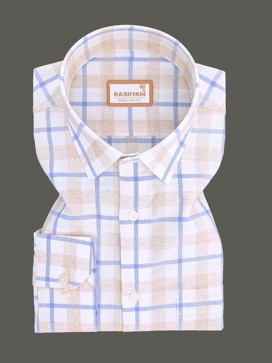 Premium Natural Linen Cotton With Powder Blue Checks