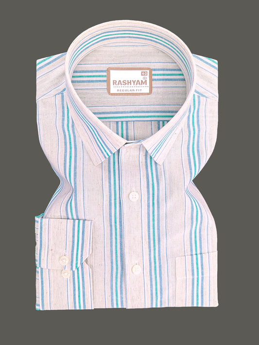 Premium Linen Cotton Off-White with Teal & Sky Blue Stripes Shirt