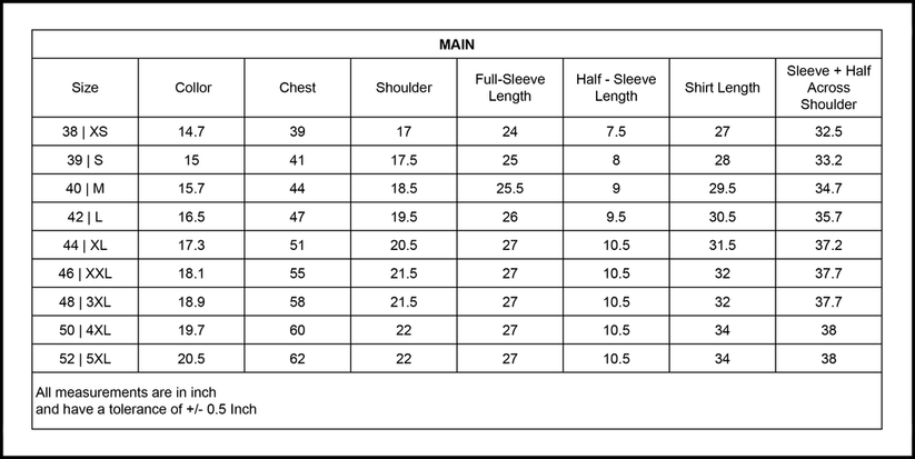 | Full Sleeve (in) | 24 | 25 | 25.5 | 26 | 27 | 27 | 27 | 27 | 27 |