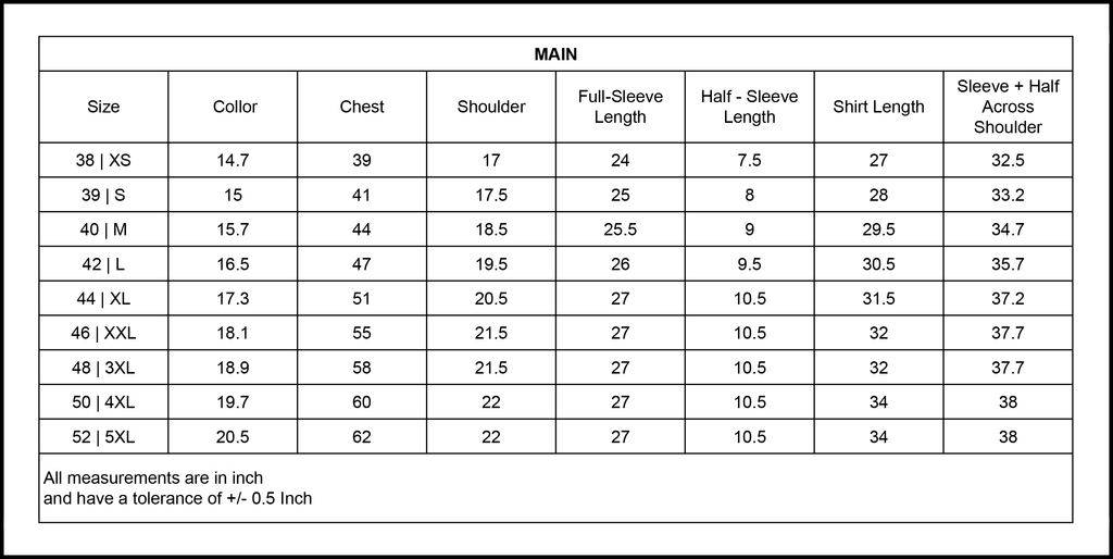 | Full Sleeve (in) | 24 | 25 | 25.5 | 26 | 27 | 27 | 27 | 27 | 27 |