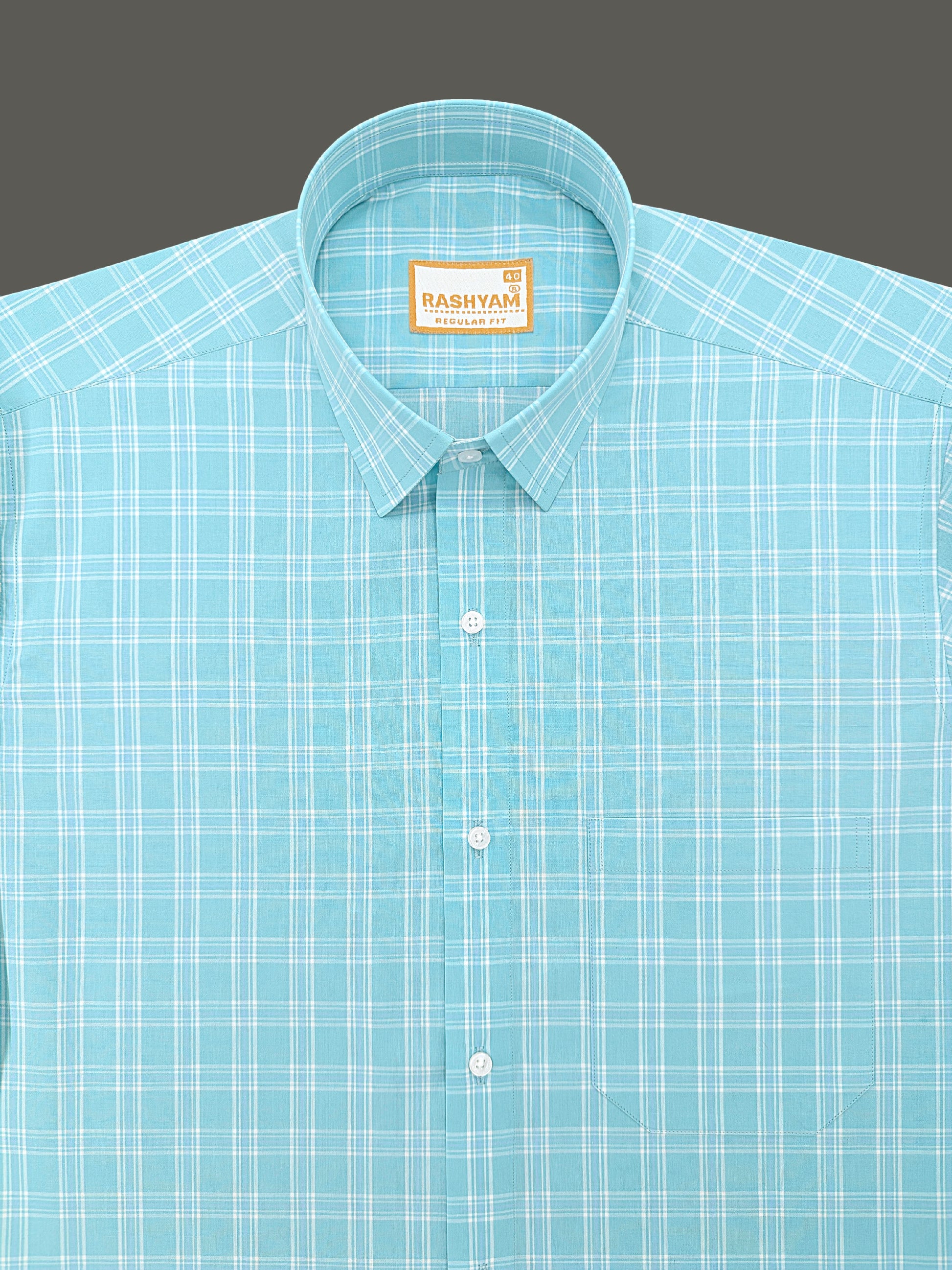 Premium Linen Cotton Greenish Cyan With Blue Checks Shirt For Men