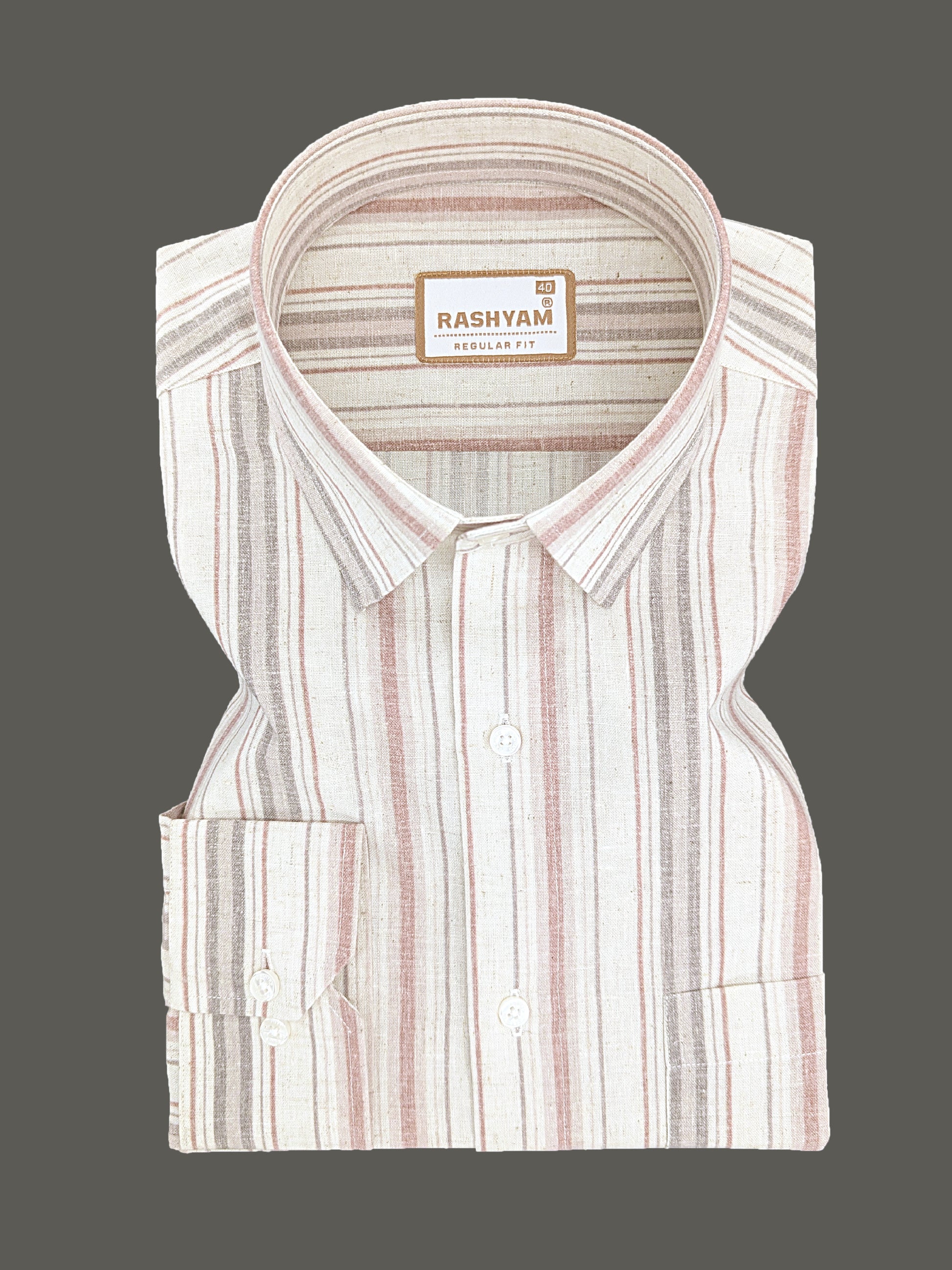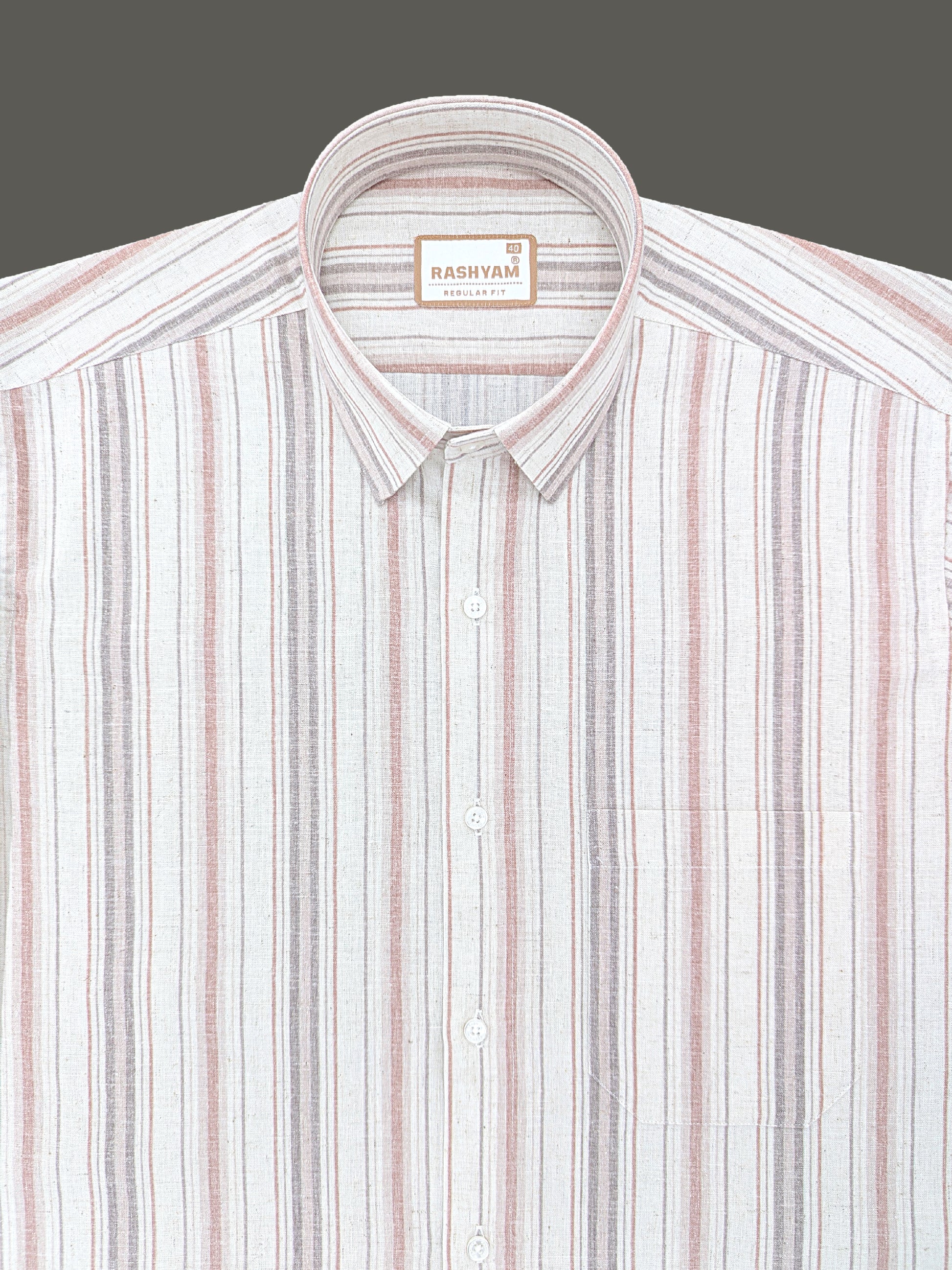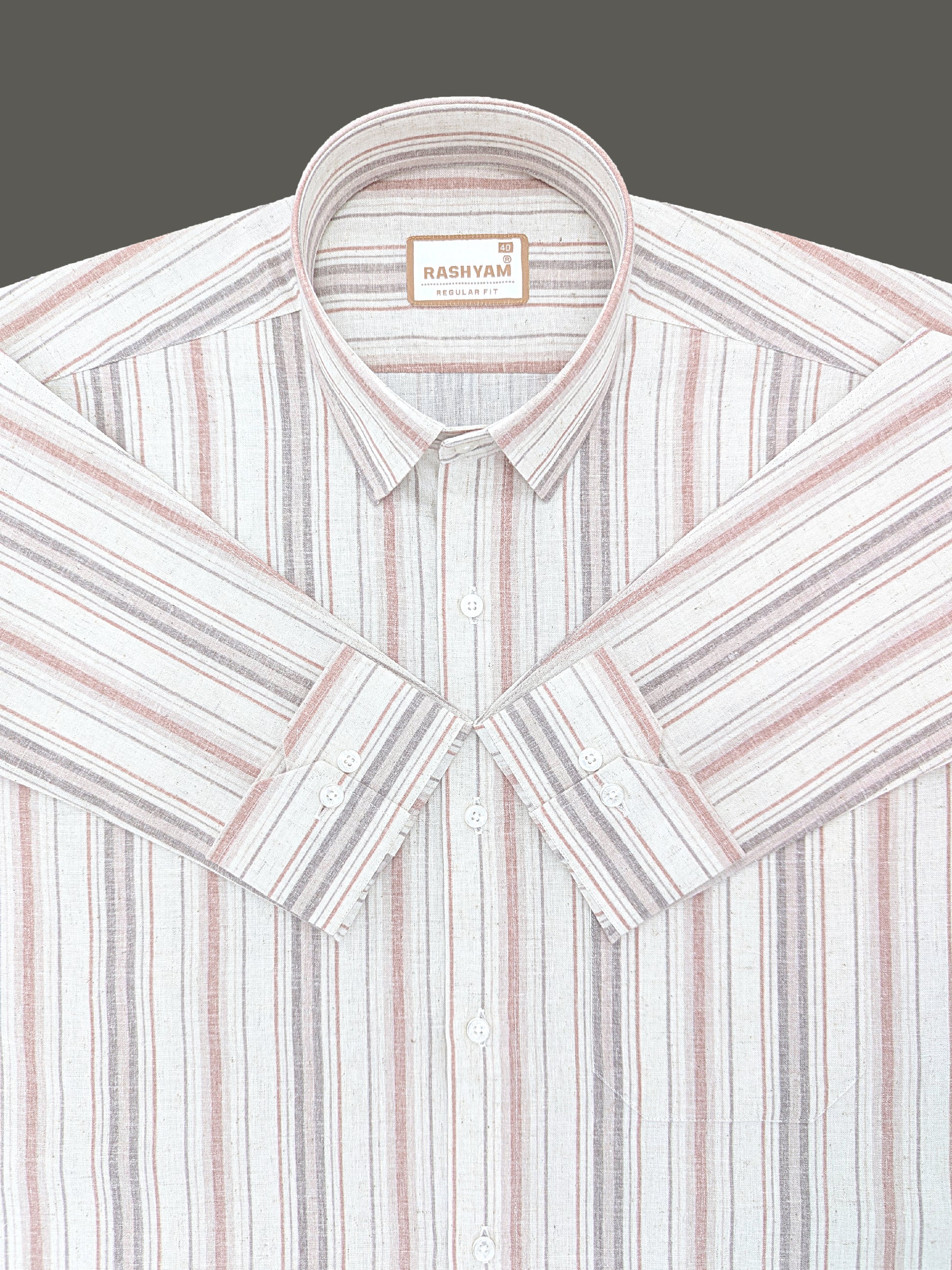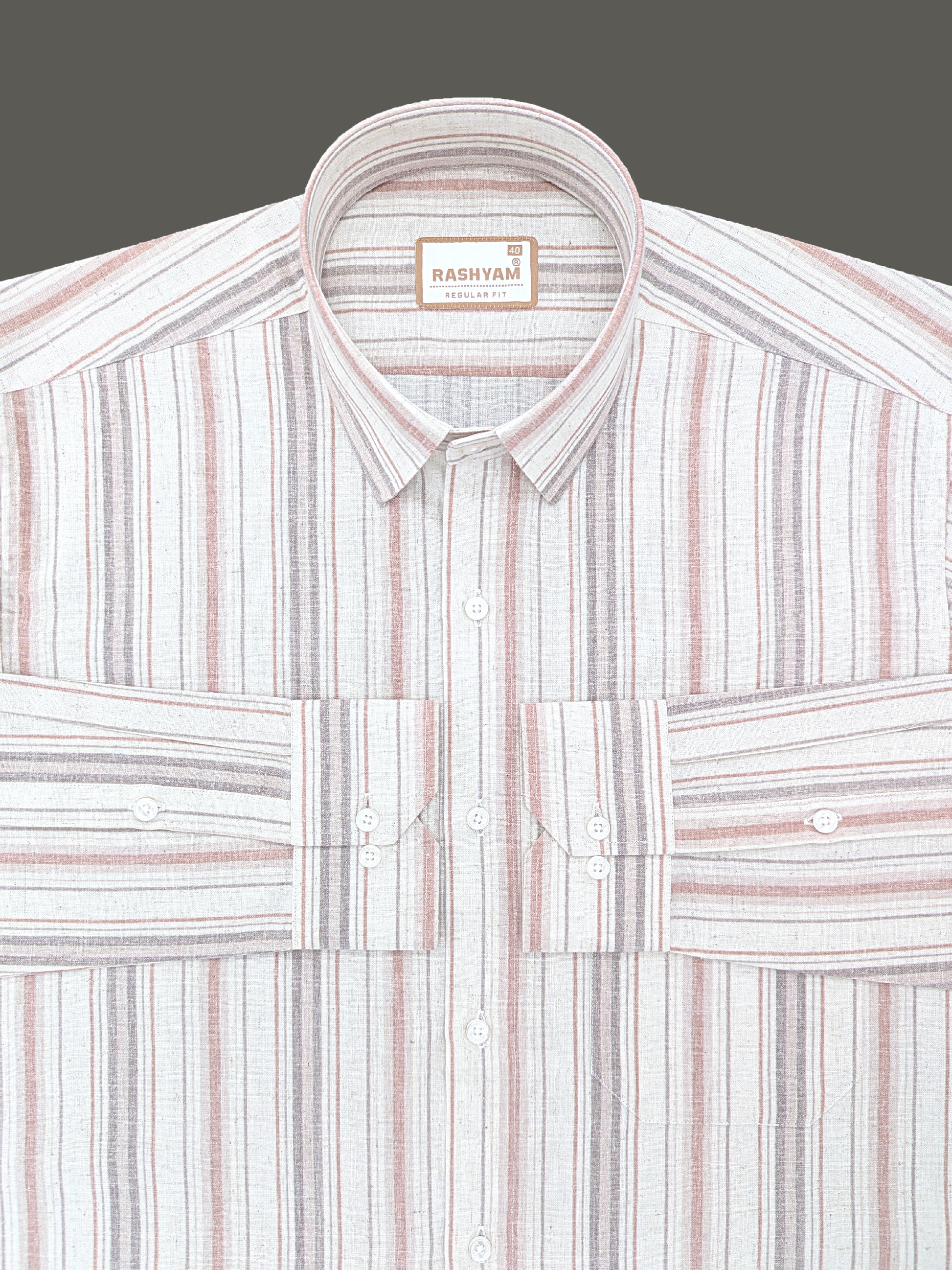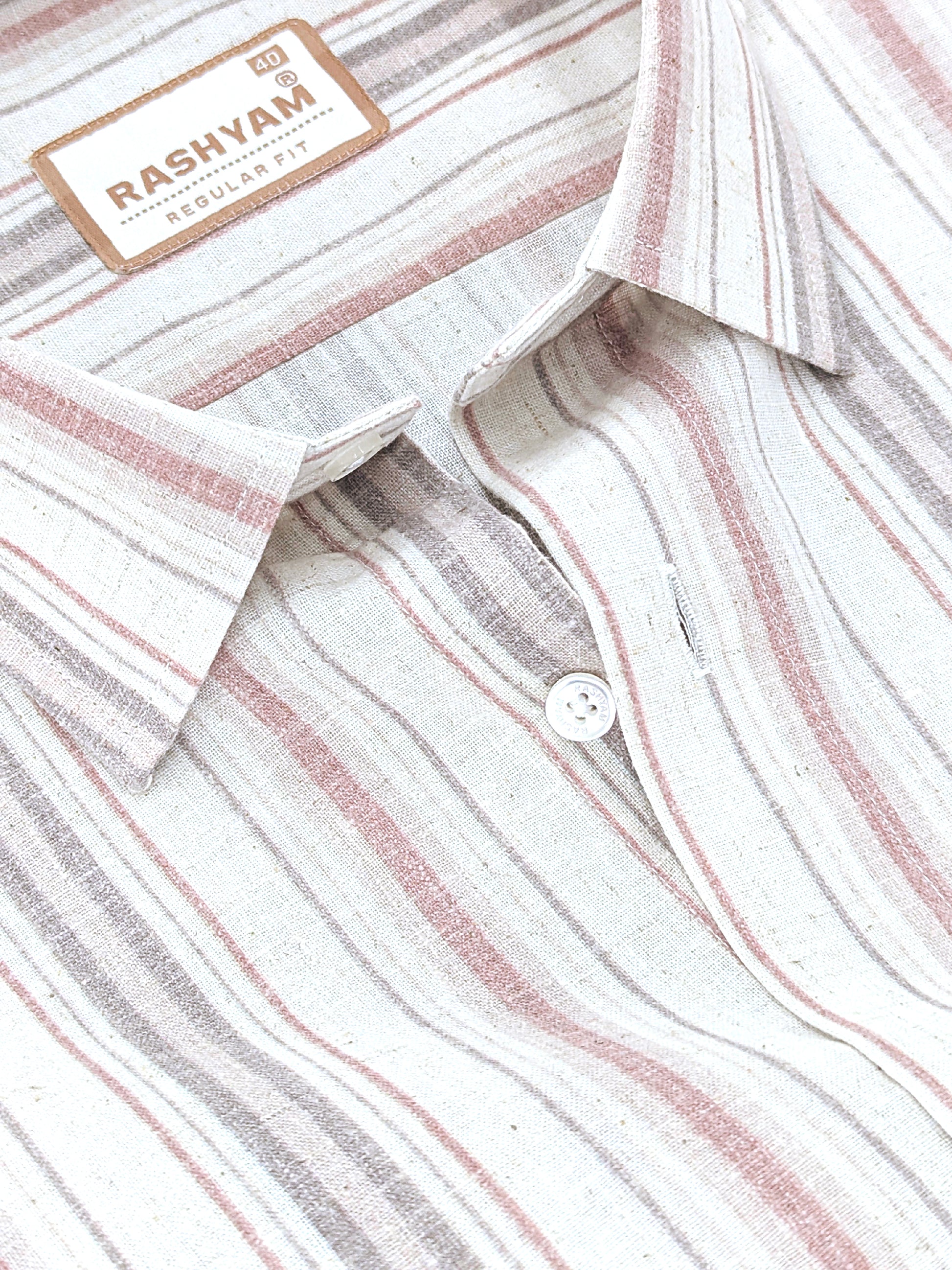 Orvieto Luxurious Linen Cotton Cream With Light Maroon And Light Grey-Brown Stripes Formal Shirt