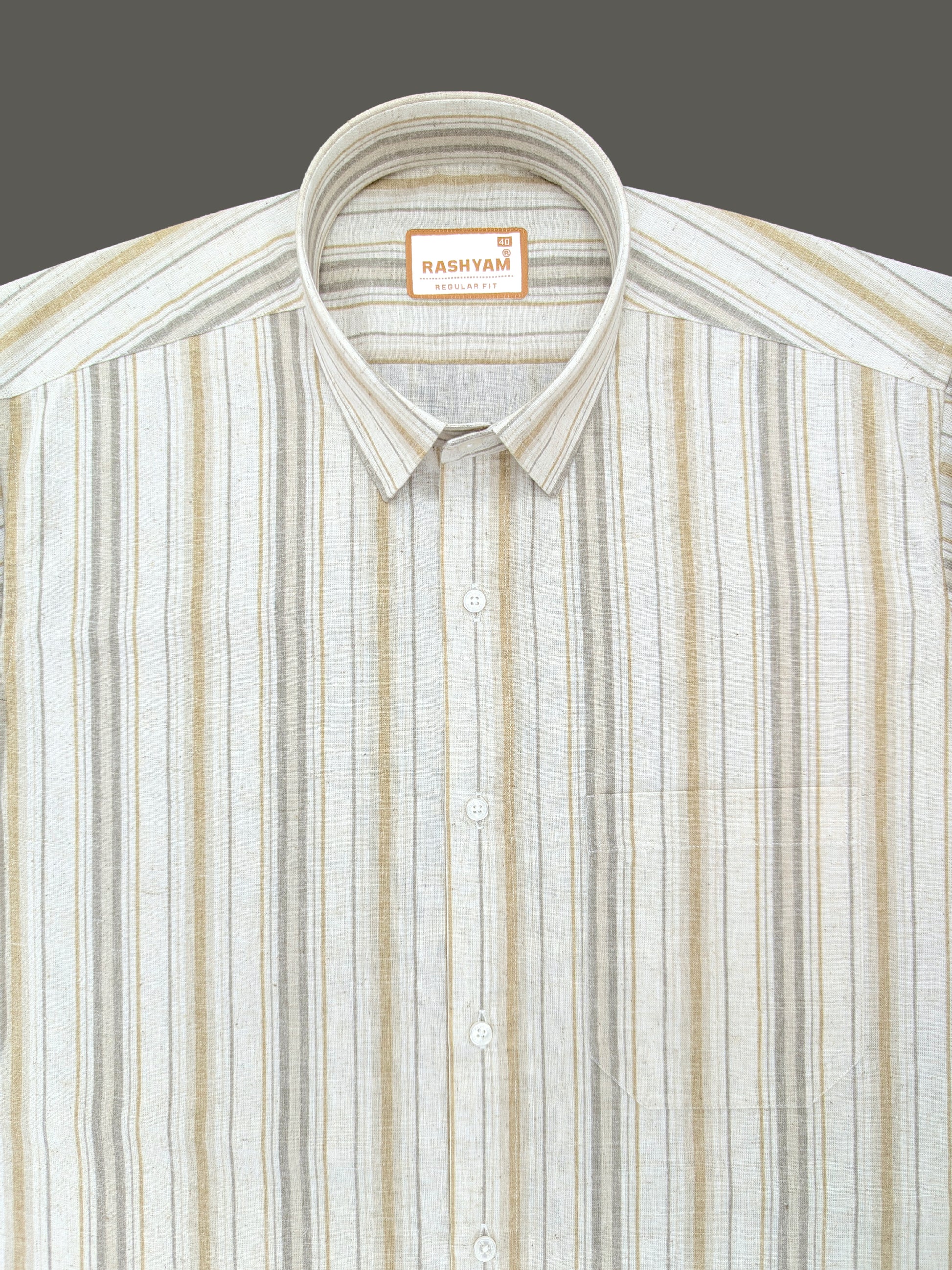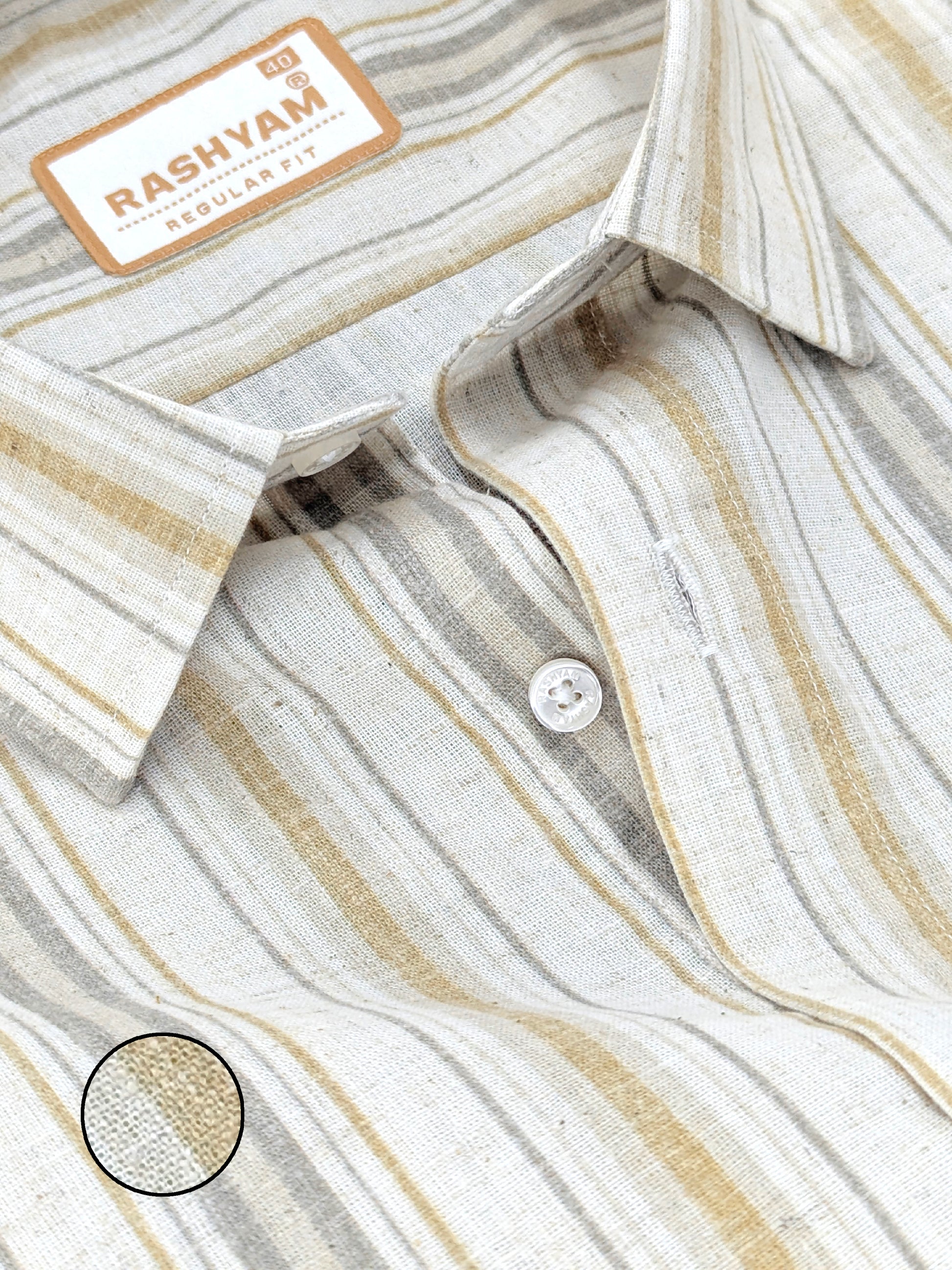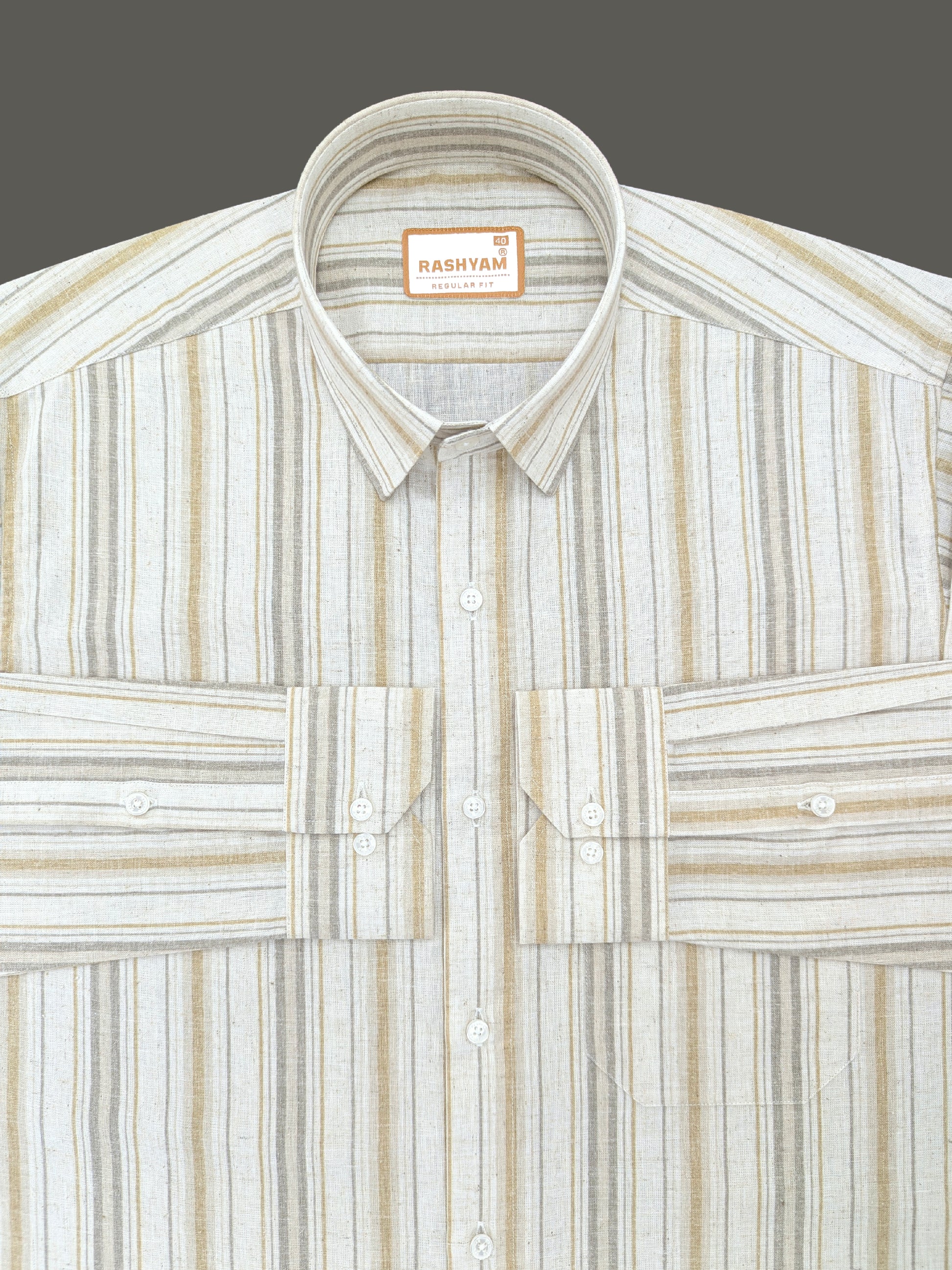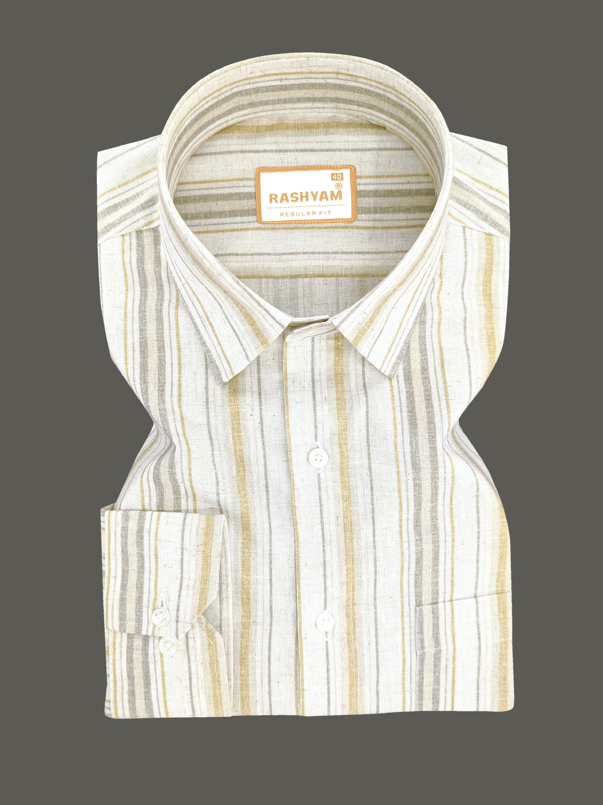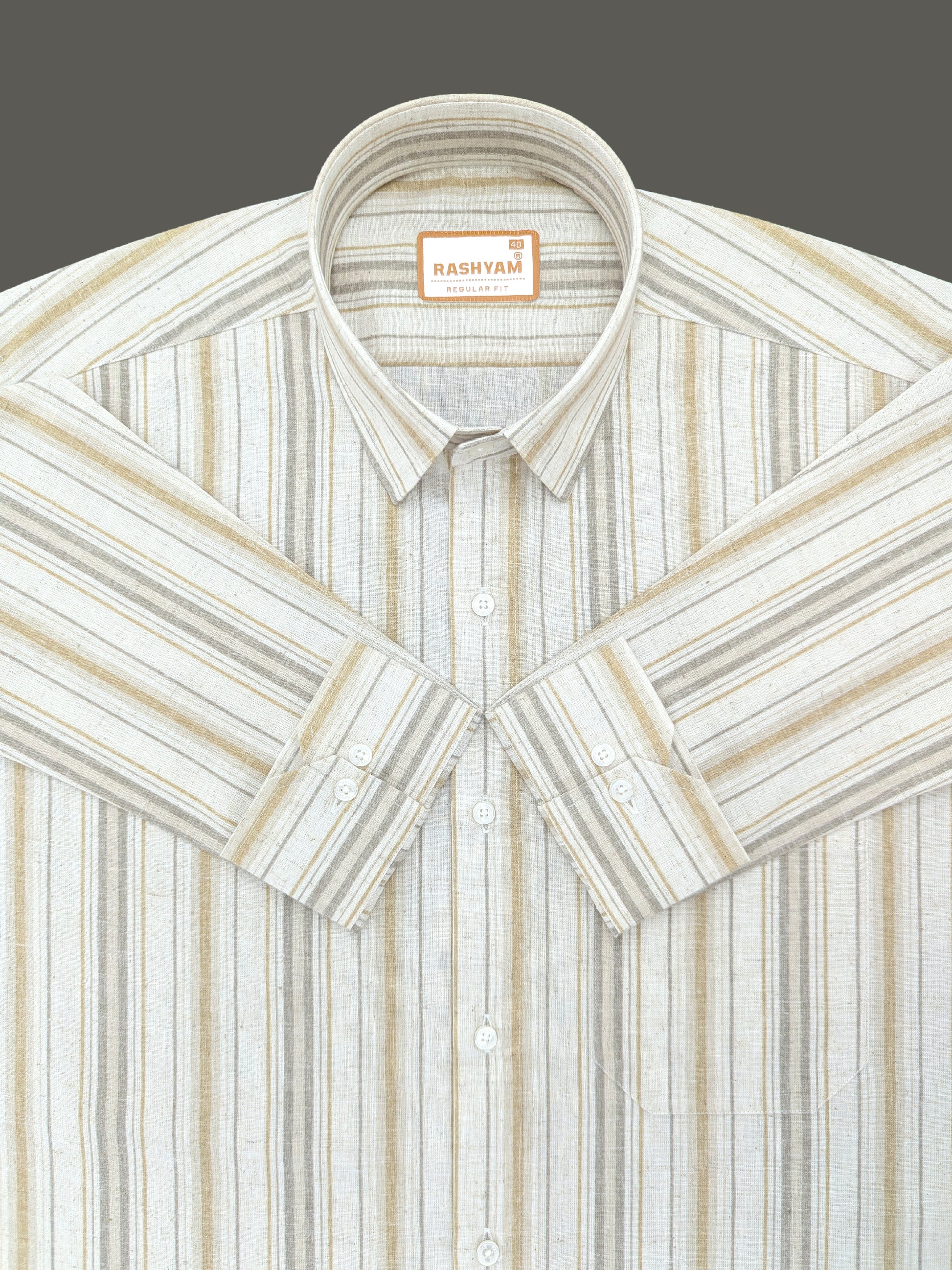 Orvieto Luxurious Linen Cotton Cream With Light Mustard And Olive Grey Stripes Formal Shirt