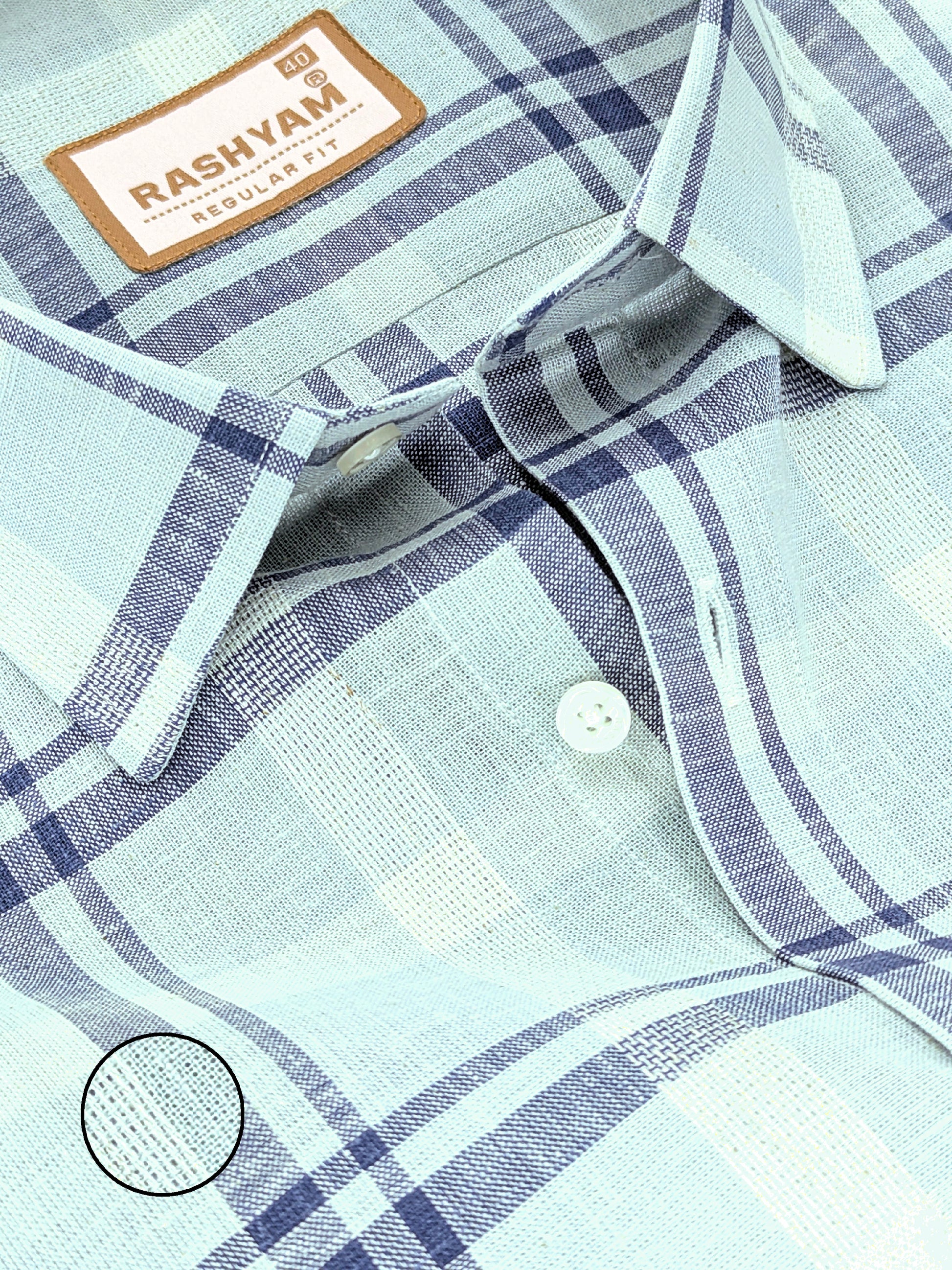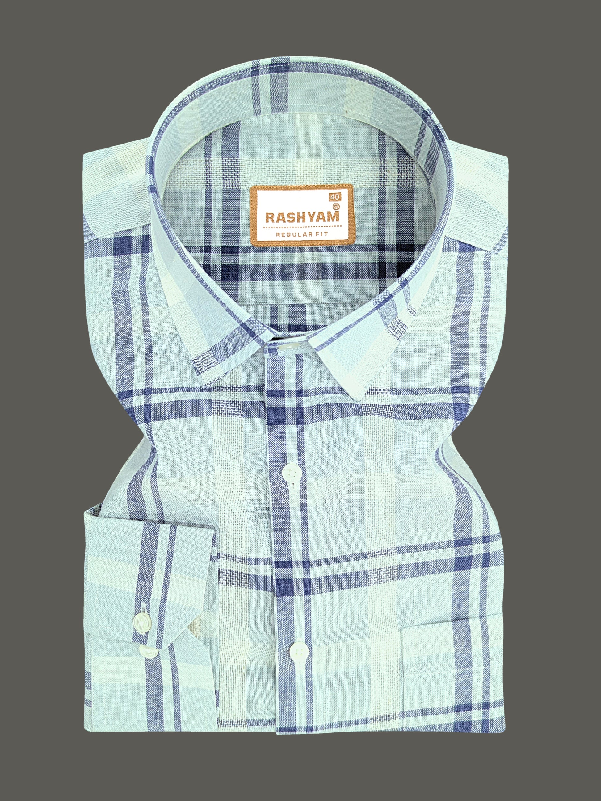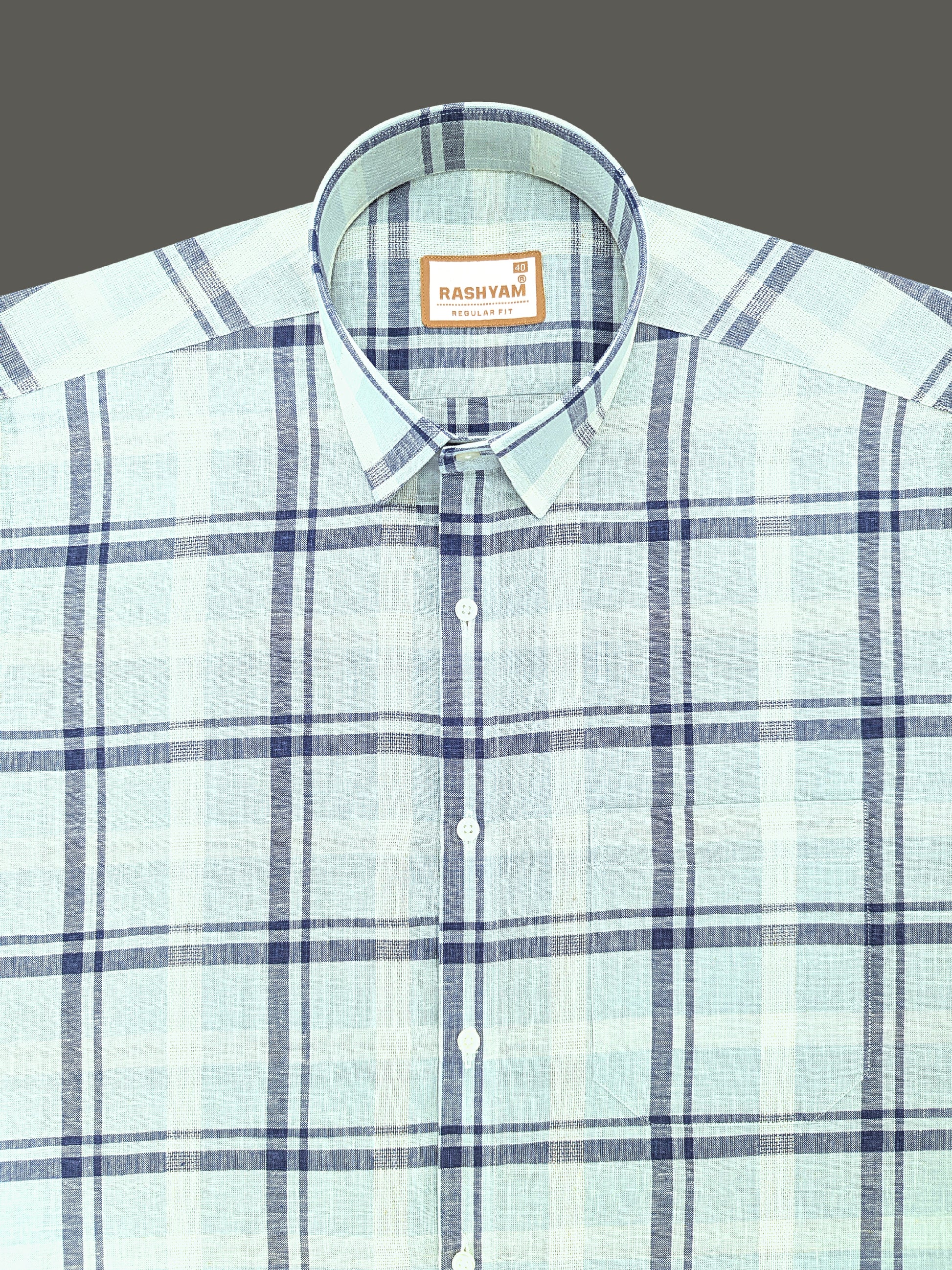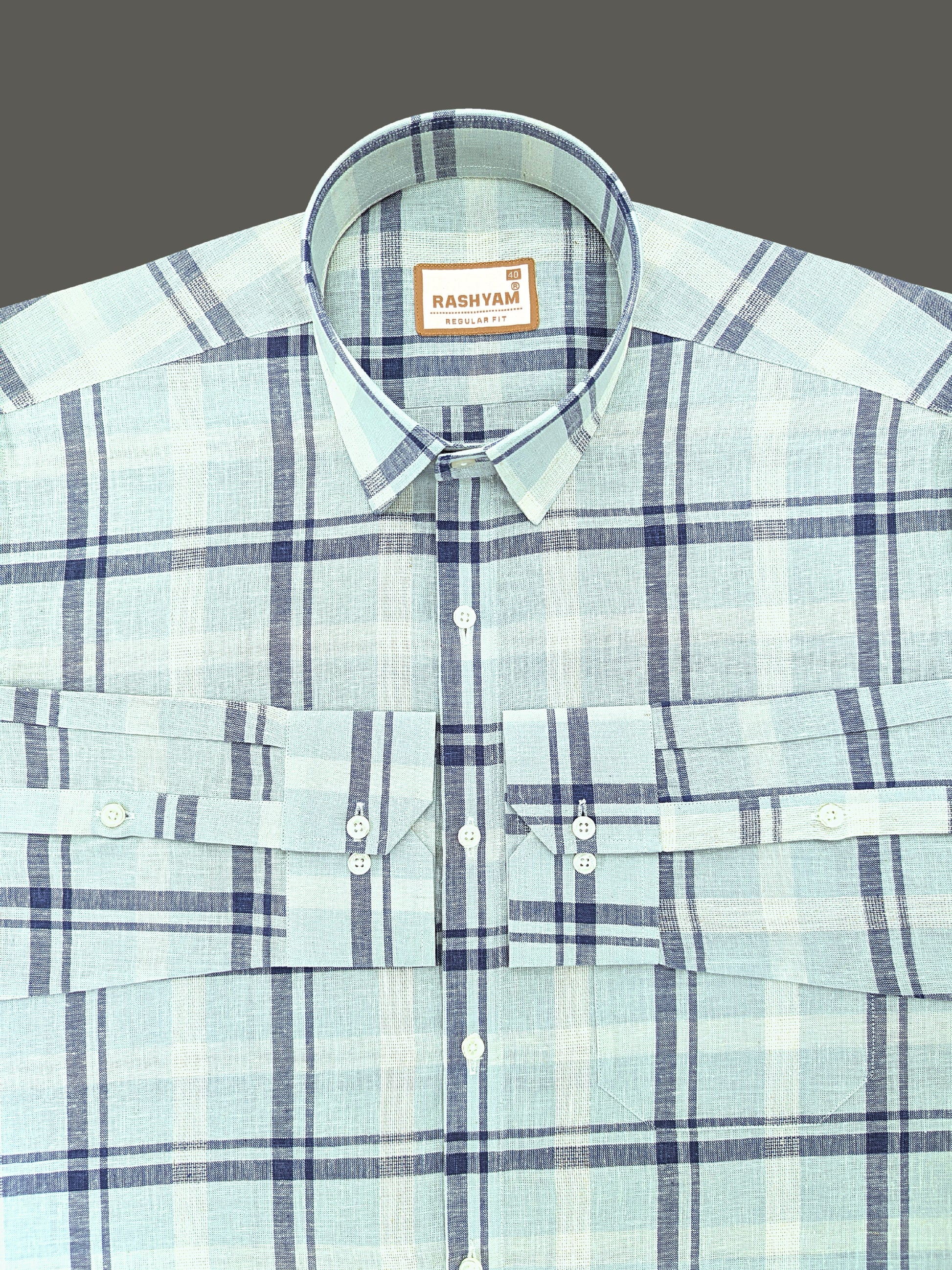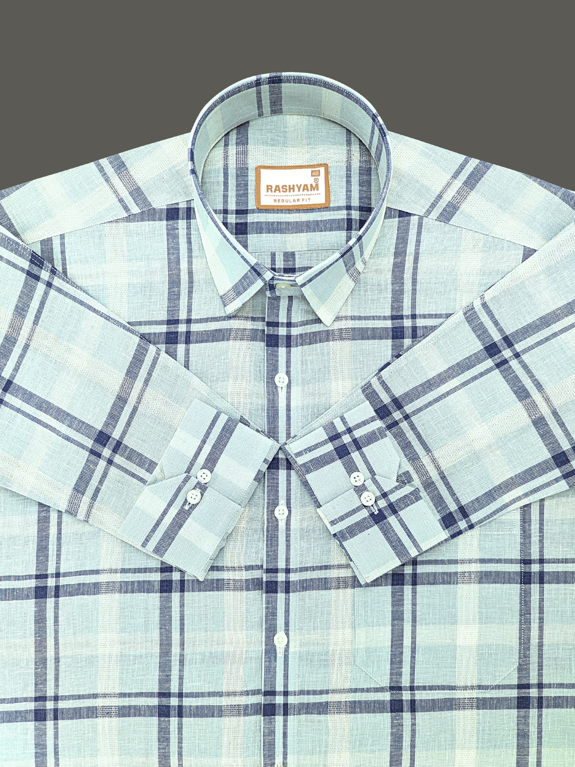 Premium Linen Cotton Greenish Cyan With Blue Checks Shirt For Men