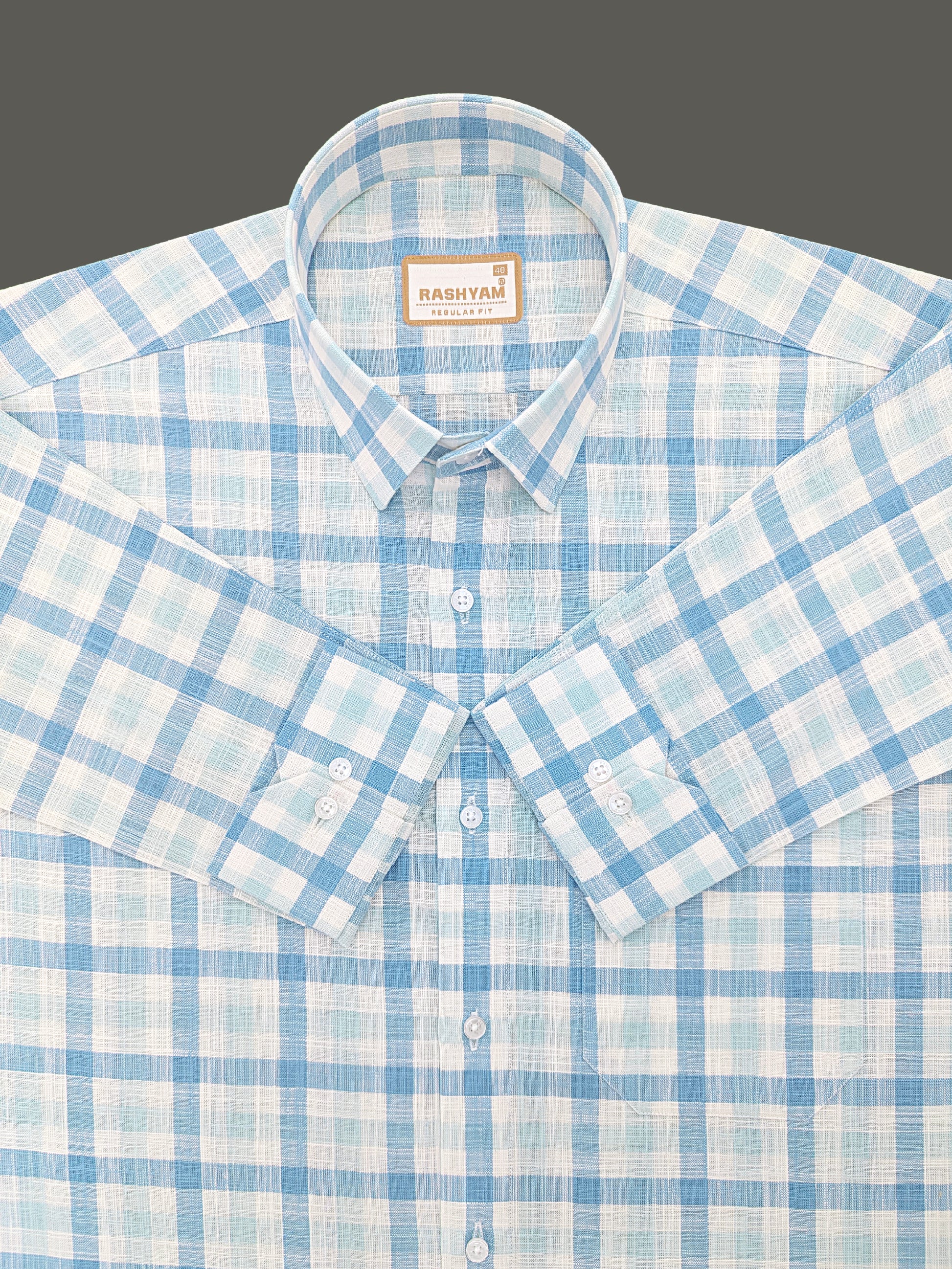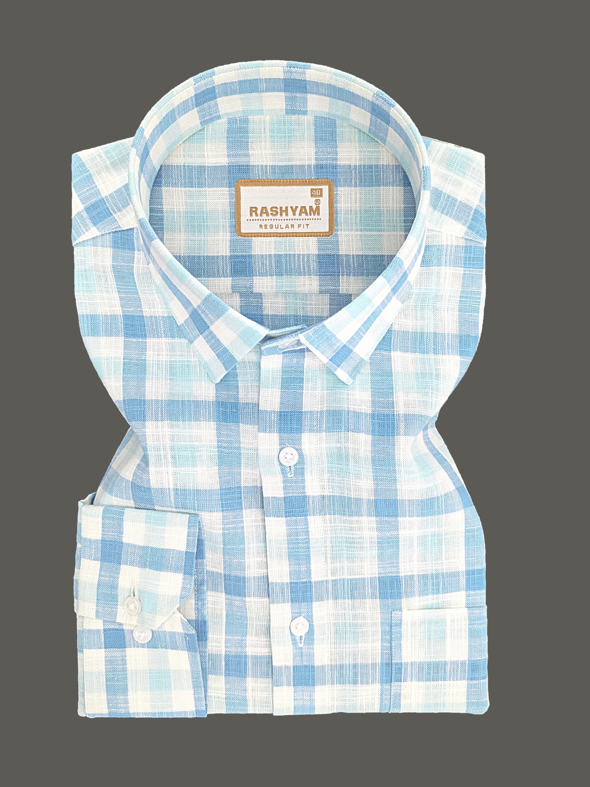 Premium Linen Cotton Greenish Cyan With Blue Checks Shirt For Men